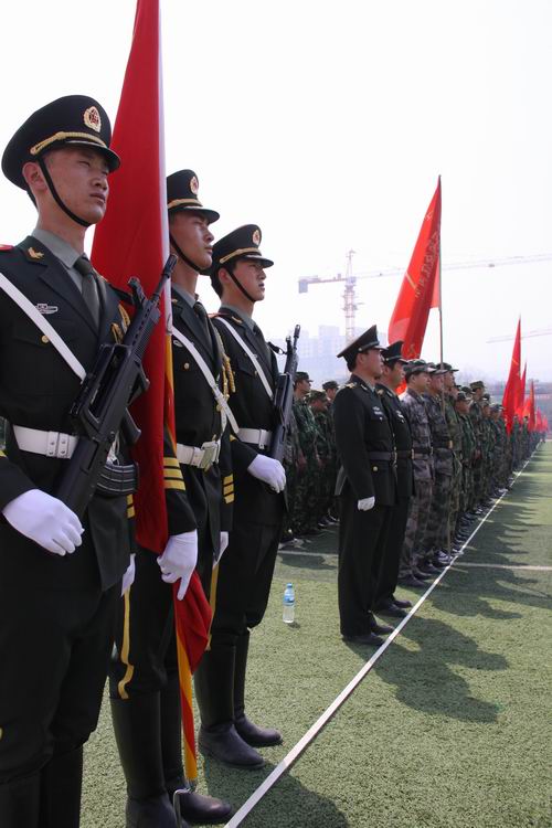 上午10時,點驗大會在嘹亮的軍歌聲中拉開序幕。預(yù)備役官兵軍容嚴(yán)整,雄姿勃發(fā),精神抖擻,士氣高昂,充分展示了當(dāng)代預(yù)備役軍人的良好精神風(fēng)貌,展現(xiàn)了部隊良好的軍政素質(zhì)和優(yōu)良的戰(zhàn)斗作風(fēng)。3名儀仗隊員護(hù)衛(wèi)著軍旗,邁著矯健的步伐從主席臺南側(cè)走到隊列北側(cè)。1500余人的預(yù)備役軍人身著整齊的軍裝,按照各自編制,在操場排成整齊的方隊,接受了首長的檢驗并進(jìn)行了宣誓儀式。點驗結(jié)束后,預(yù)備役官兵進(jìn)行了擒敵拳、盾牌警棍術(shù)和防爆隊形等三個科目的匯報演示。通過集結(jié)點驗,鍛煉提高了團(tuán)首長機(jī)關(guān)和營連各級指揮員的組織協(xié)調(diào)能力,探索研究了組織全團(tuán)集結(jié)點驗的方法路子,錘煉了部隊,強(qiáng)化了作風(fēng),有效提高了部隊快速動員和隨時應(yīng)召的能力。