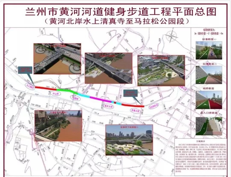 蘭州市黃河河道健身步道工程(黃河北岸水上清真寺至馬拉松公園段)位于黃河北岸河灘,全長(zhǎng)2924.317米,西起黃河北岸金城關(guān)古建一條街水上清真寺,沿途經(jīng)過(guò)中山橋、元通黃河大橋、羅鍋溝洪道、音樂(lè)噴泉廣場(chǎng)、城關(guān)黃河大橋、大砂溝洪道、金雁黃河大橋至馬拉松公園。主要建設(shè)內(nèi)容包括人行步道、健身跑道、棧橋、照明工程、生態(tài)美化工程、相關(guān)配套設(shè)施及中山橋、元通大橋、金雁大橋下和音樂(lè)噴泉廣場(chǎng)節(jié)點(diǎn)景觀改造。