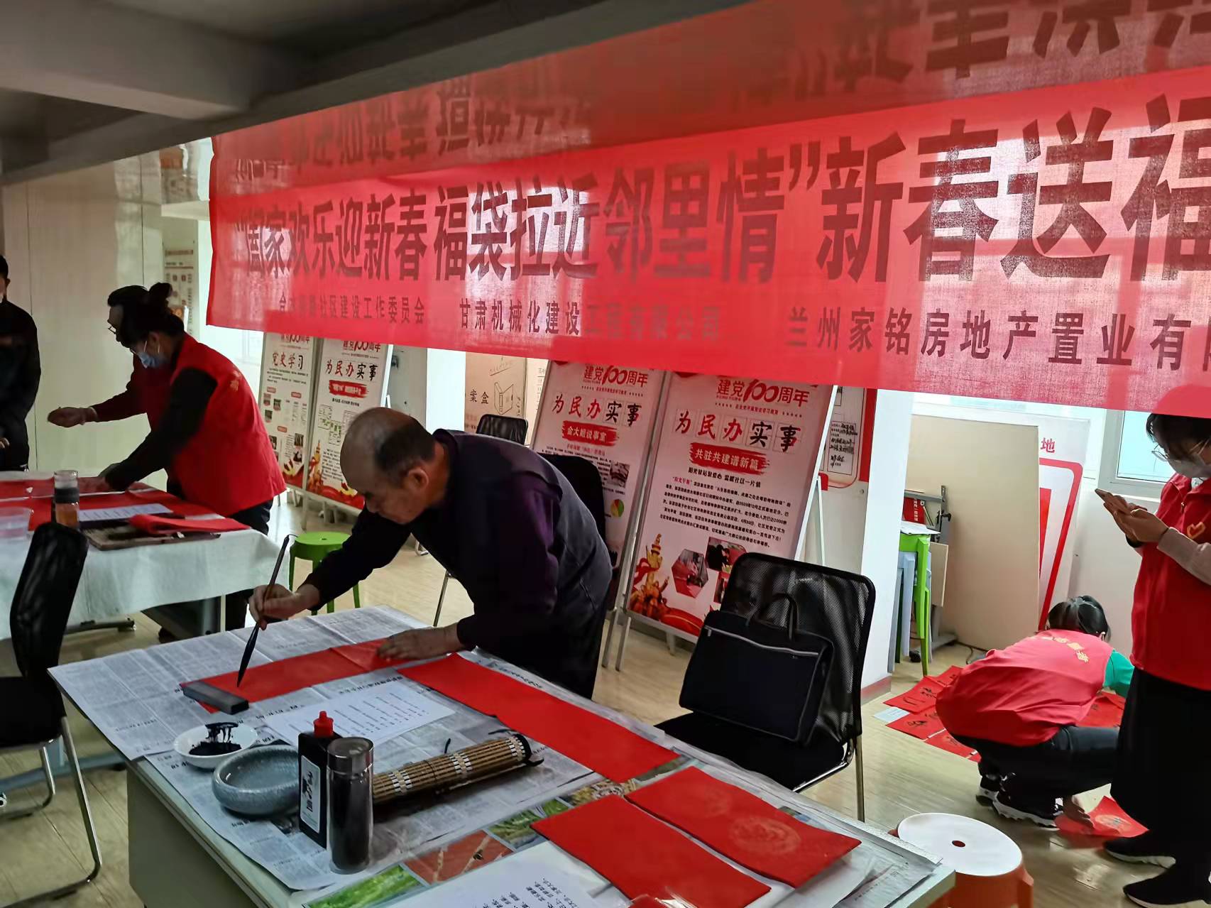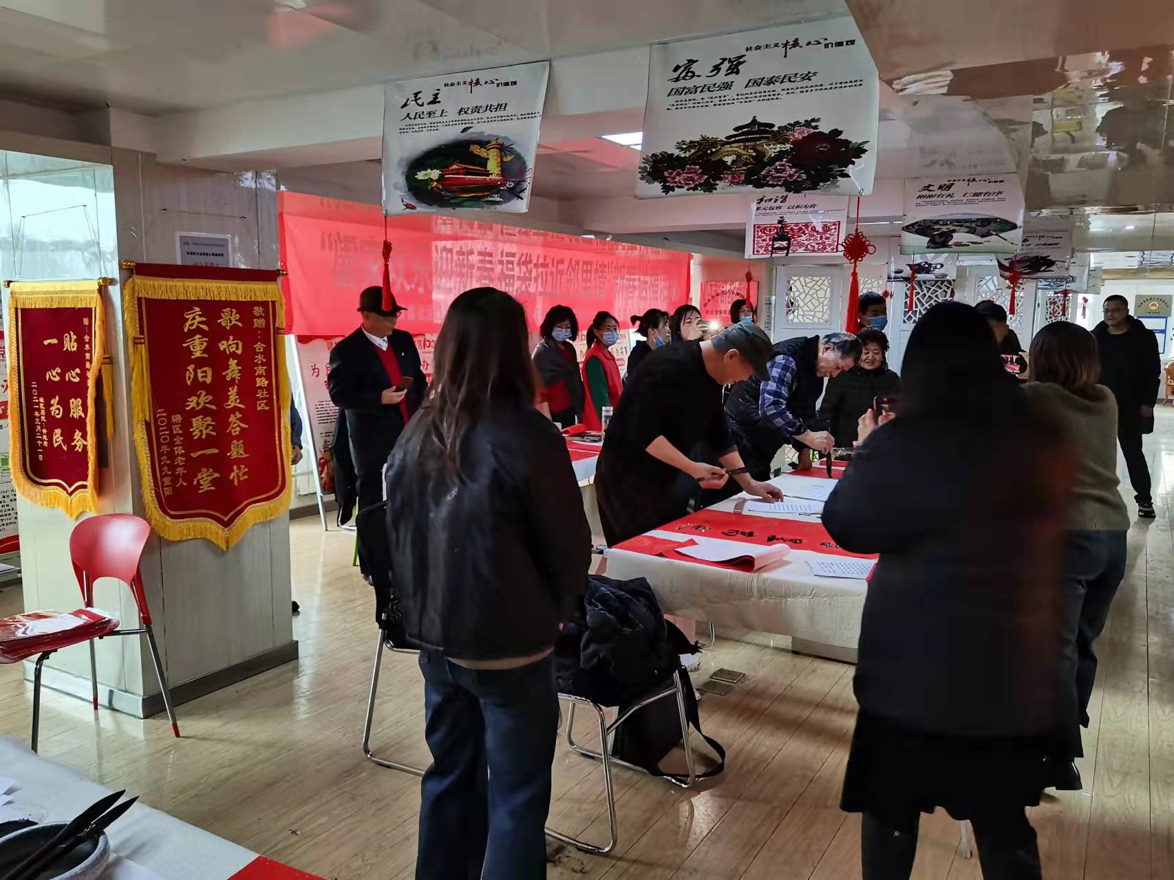 四季青街道合水南路社區(qū)大廳內(nèi),伴隨著喜氣洋洋的音樂,書法愛好者們不拘一格、揮毫潑墨,寫下一幅幅新春的寄語。