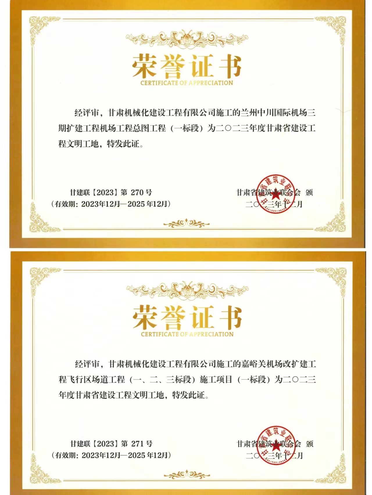 近日,我司承建的蘭州中川國(guó)際機(jī)場(chǎng)二期擴(kuò)建工程機(jī)場(chǎng)工程總圖工程 (一標(biāo)段)與嘉峪關(guān)機(jī)場(chǎng)改擴(kuò)建工飛行區(qū)場(chǎng)道(一、二、三標(biāo)段) 施工項(xiàng)目 (一標(biāo)段) 獲得2023年度甘肅省建設(shè)工程文明工地榮譽(yù)稱號(hào)。