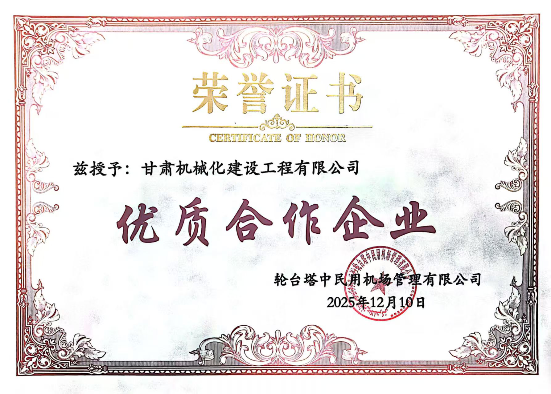 近日,新疆輪臺(tái)機(jī)場(chǎng)項(xiàng)目業(yè)主單位正式發(fā)布表彰決定,對(duì)項(xiàng)目建設(shè)期間履約盡責(zé)、實(shí)績(jī)突出的合作方及個(gè)人予以通報(bào)嘉獎(jiǎng),我司憑借扎實(shí)的工程履約能力與優(yōu)質(zhì)服務(wù)獲評(píng)“優(yōu)質(zhì)合作企業(yè)”,項(xiàng)目負(fù)責(zé)人同步斬獲“優(yōu)秀項(xiàng)目經(jīng)理”稱(chēng)號(hào),實(shí)現(xiàn)集體與個(gè)人榮譽(yù)雙豐收,彰顯業(yè)主單位對(duì)我司項(xiàng)目建設(shè)工作的高度認(rèn)可。